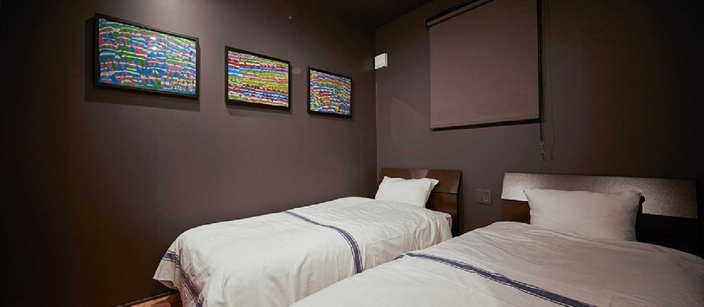 GALLERY HOTEL「DISTORTION9」は、アートに関心が高い旅行者に向けて、日本のアウトサイダーアートの魅力を発信する宿泊施設です。客室に展示しているアート作品は、滋賀県甲賀市にある「やまなみ工房」に通所するアーティストによるもので、すべて購入可能。既成概念にとらわれない自由で革新的な彼らの表現は、国内だけでなく世界中のアートシーンから注目を集めています。