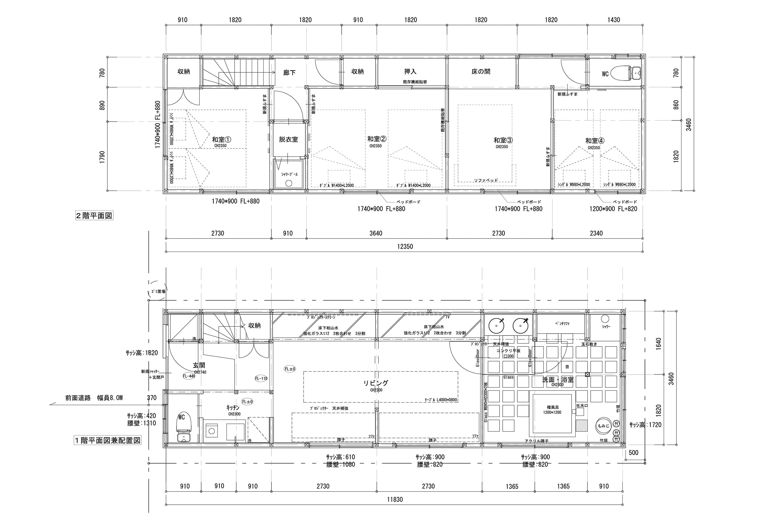 建物は大阪で多く見られる間口が狭く奥行きが深い町家形式の建物のため、ダイニング→リビング→お風呂と奥行き深い続き間を活かした一体的な空間としました。