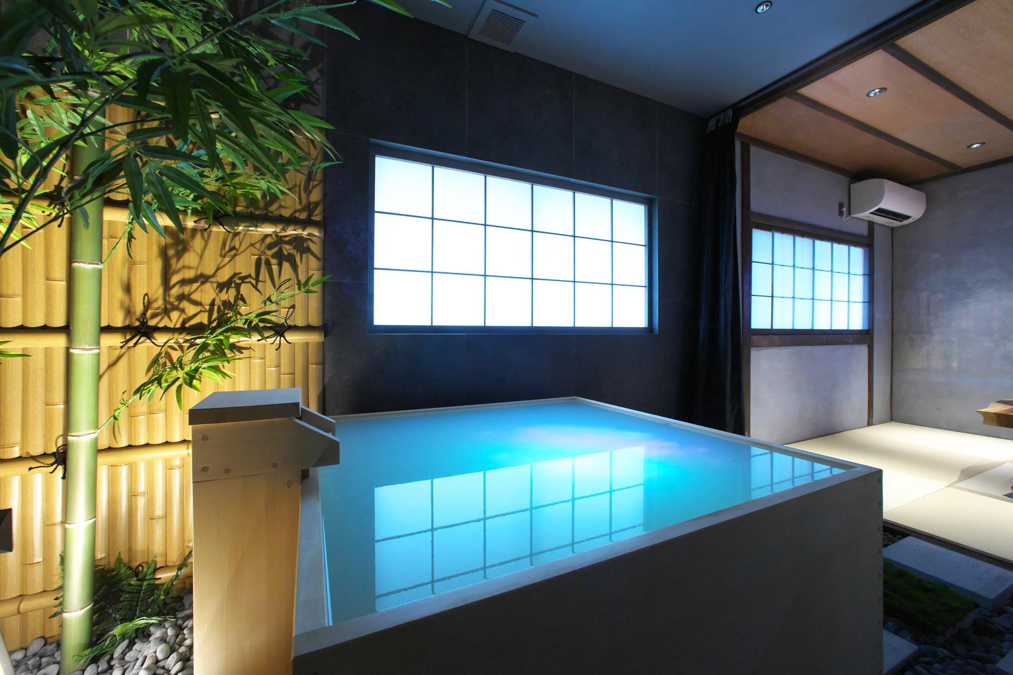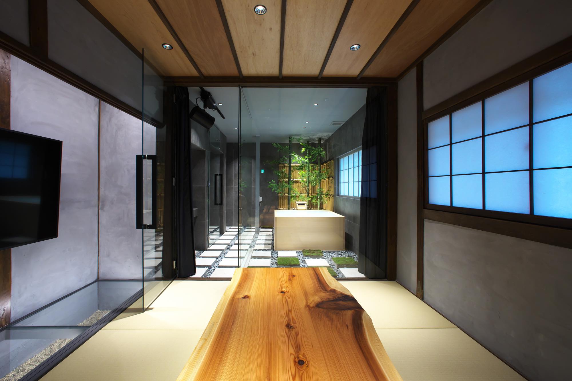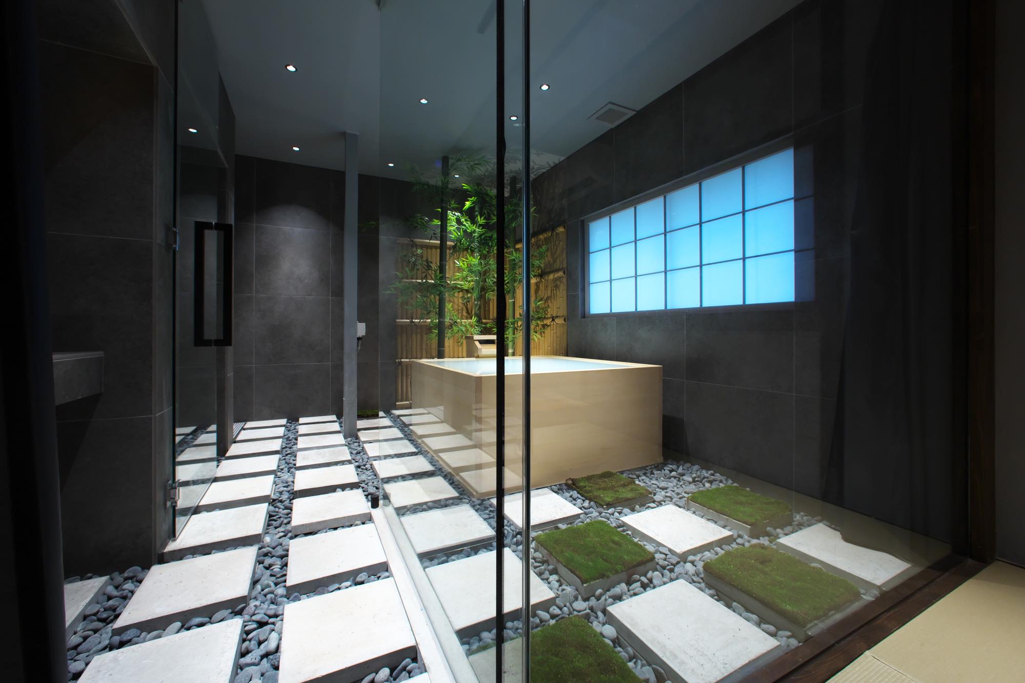 施設内には、1枚石(レコストーン)の玄関扉、ガラス張り枯山水、枯山水を現代的に解釈デザインした檜風呂、木工用CNCルーターを利用した伝統格子を使用し、日本の特徴的なデザイン要素でお客様をもてなします。