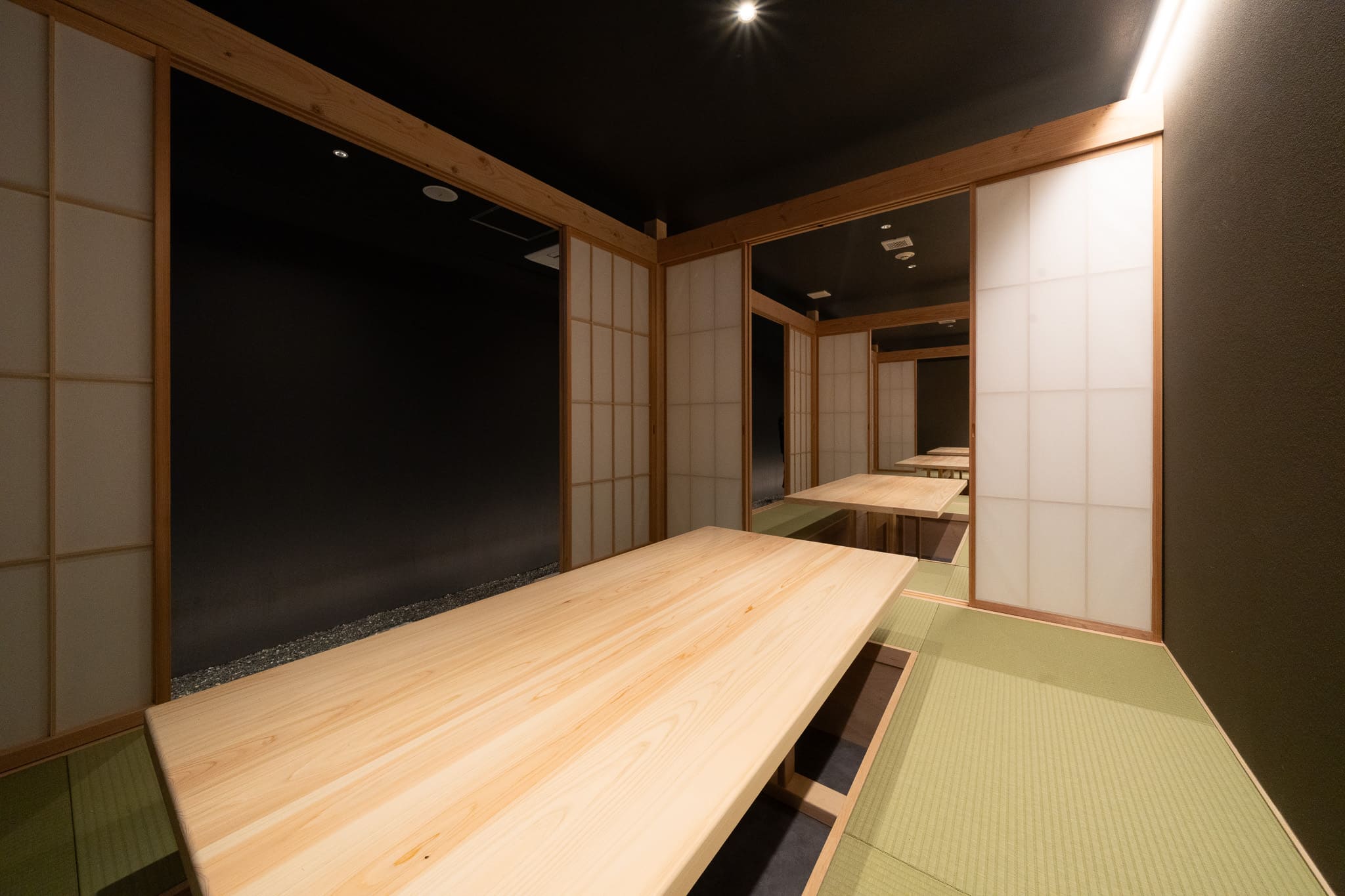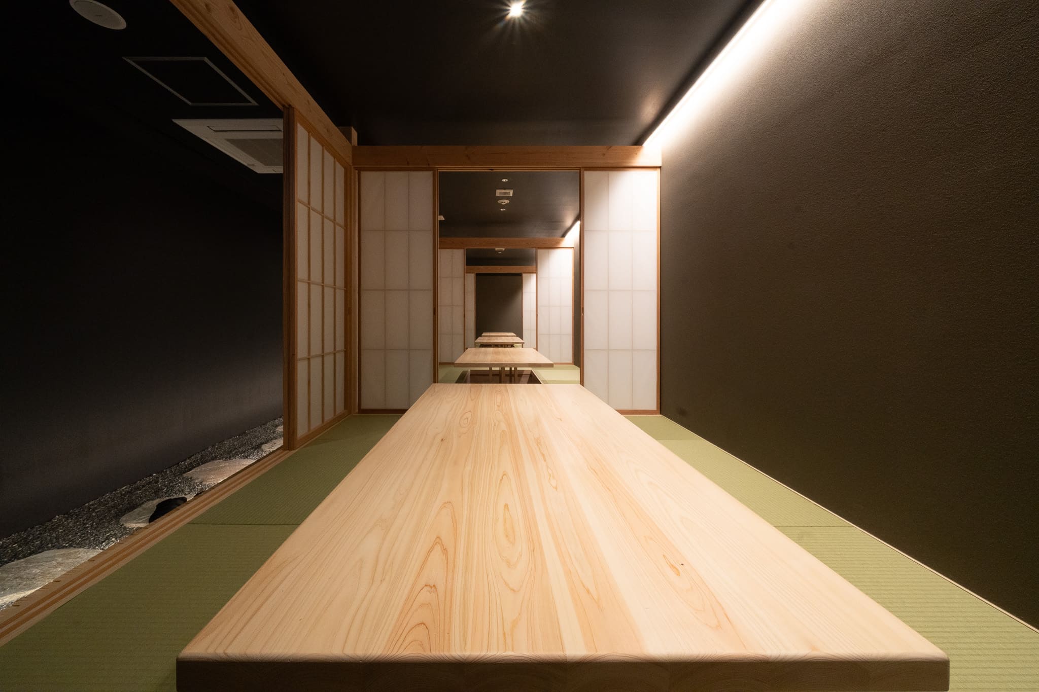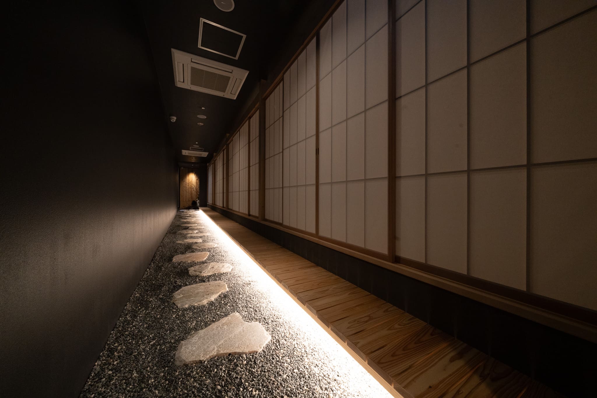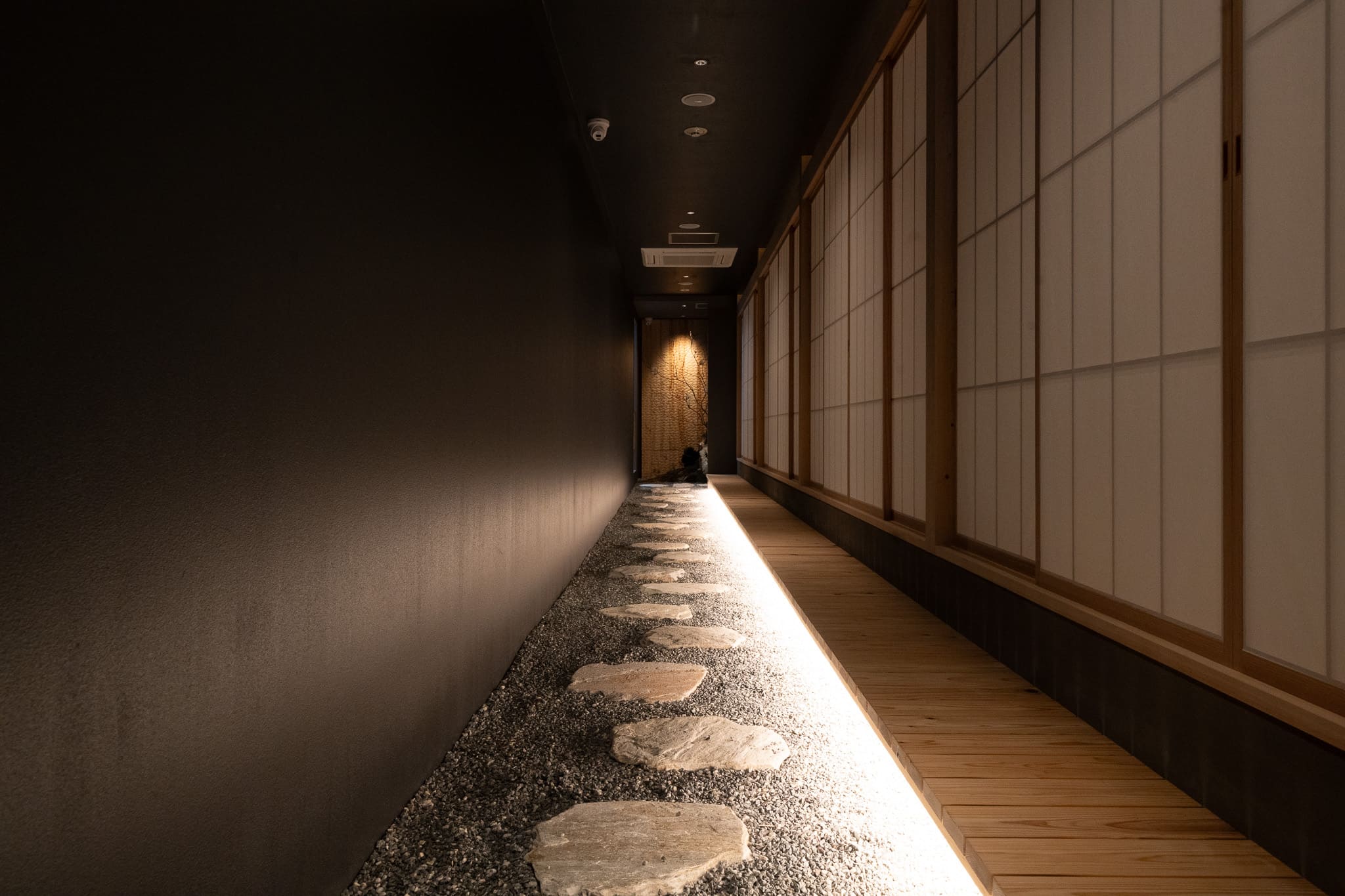 単なる通過動線ではなく、歩くことで感覚が切り替わる“体験のプロセス”として空間を構成した。飛び石や砂利の質感は足裏の感覚を呼び起こし、障子越しの柔らかな光は外界を曖昧に遮断する。これらの要素が重なり合うことで、身体と意識をゆるやかに内側へと導く。
