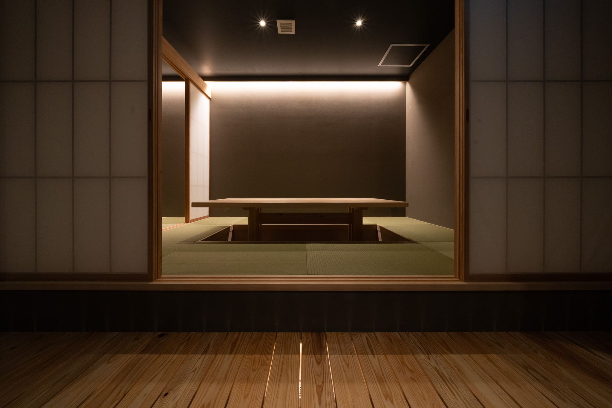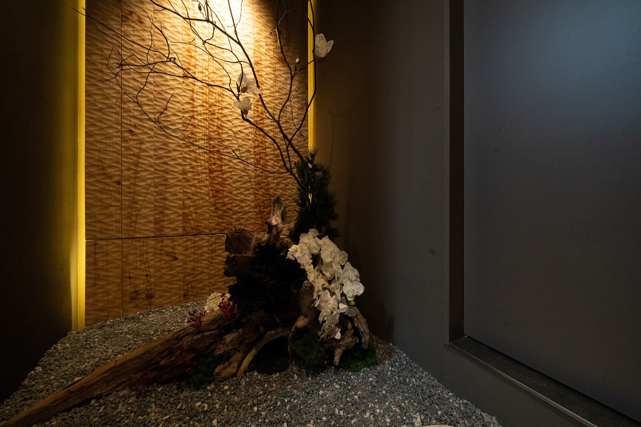 また、光の設計においては直接照明を極力排し、低い位置からの間接光と素材の反射によって空間に奥行きを与えた。木、石、土といった自然素材の表情を際立たせることで、時間の経過とともに質感が深まる環境を創出している。